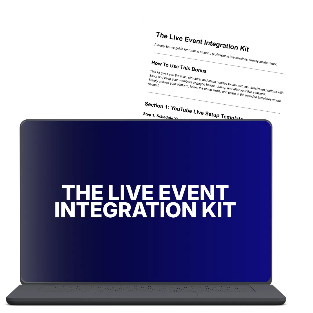 BONUS 3: The Live Event Integration Kit - Ready to use setups and templates for running smooth live sessions inside Skool using YouTube, Zoom, or OBS.